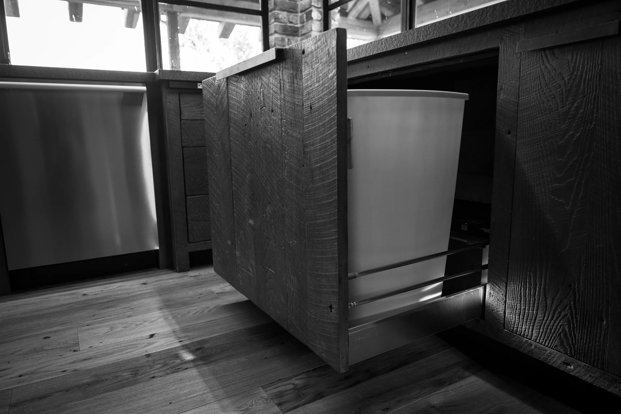 /This is a hands free trash roll out I just built into a kitchen. Click here to see it in action! Youtube videoThe video shows a light bump with my hand to engage the servo drive motor, but this could be done with your knee or foot (making it "hands free"). The roll out holds two 50 qt. waste baskets, and is driven by two servo-drive motors (Blum brand). The stainless steel drawer profiles are also from Blum (Tandembox Intivo). Video by Joel Wilson.
