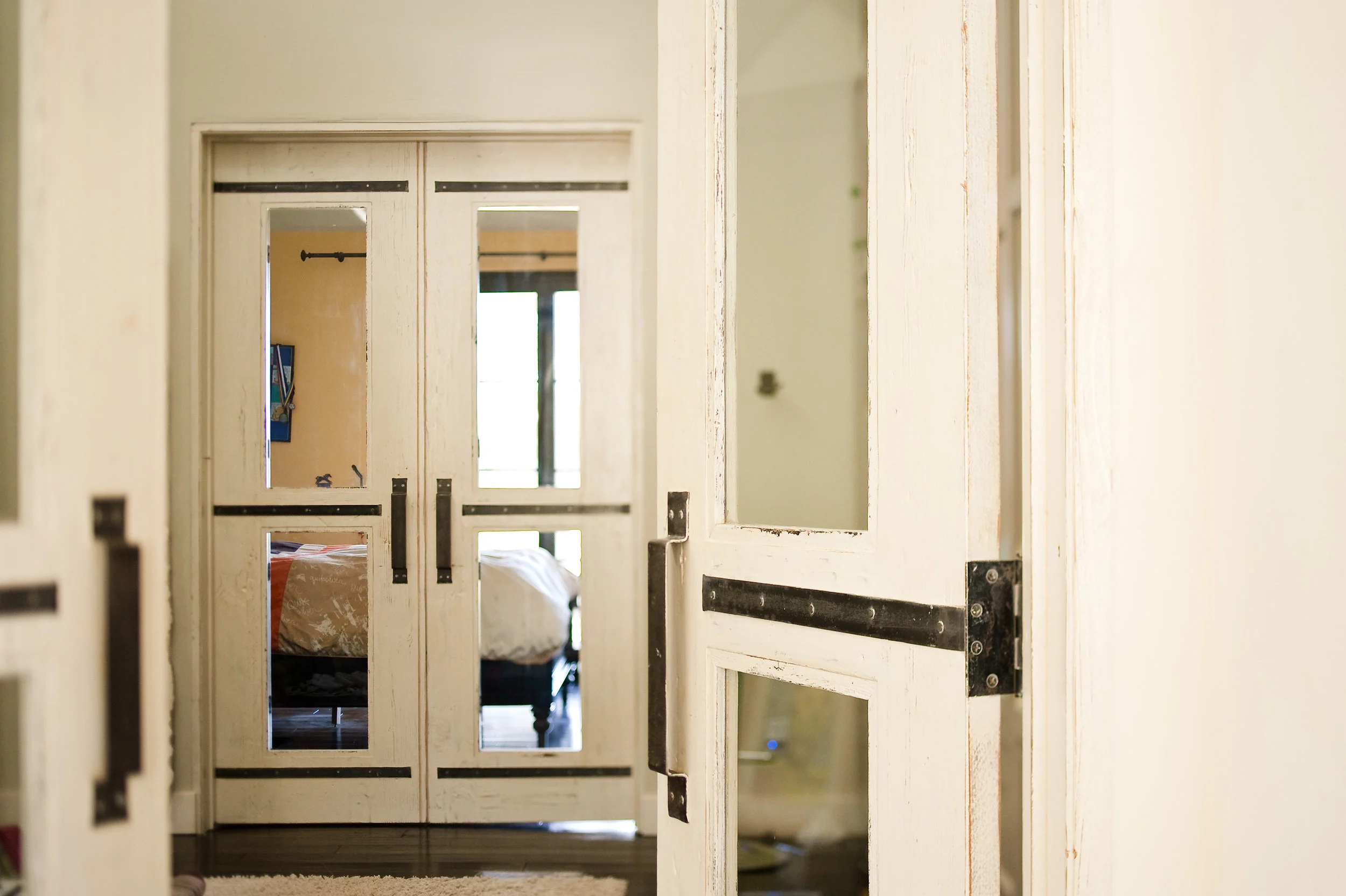 This is a pair of bedroom doors with glass panels. Inside the doors there are shutters for privacy.