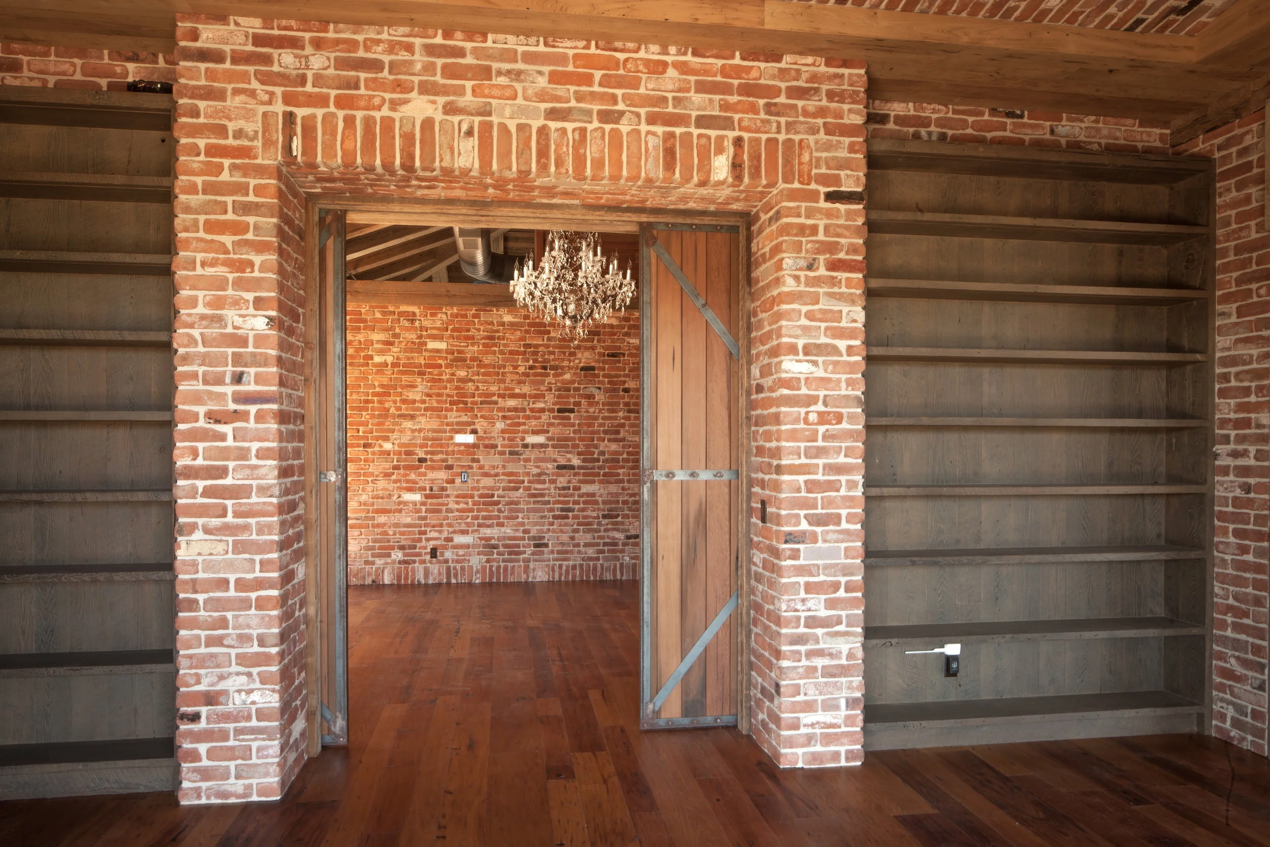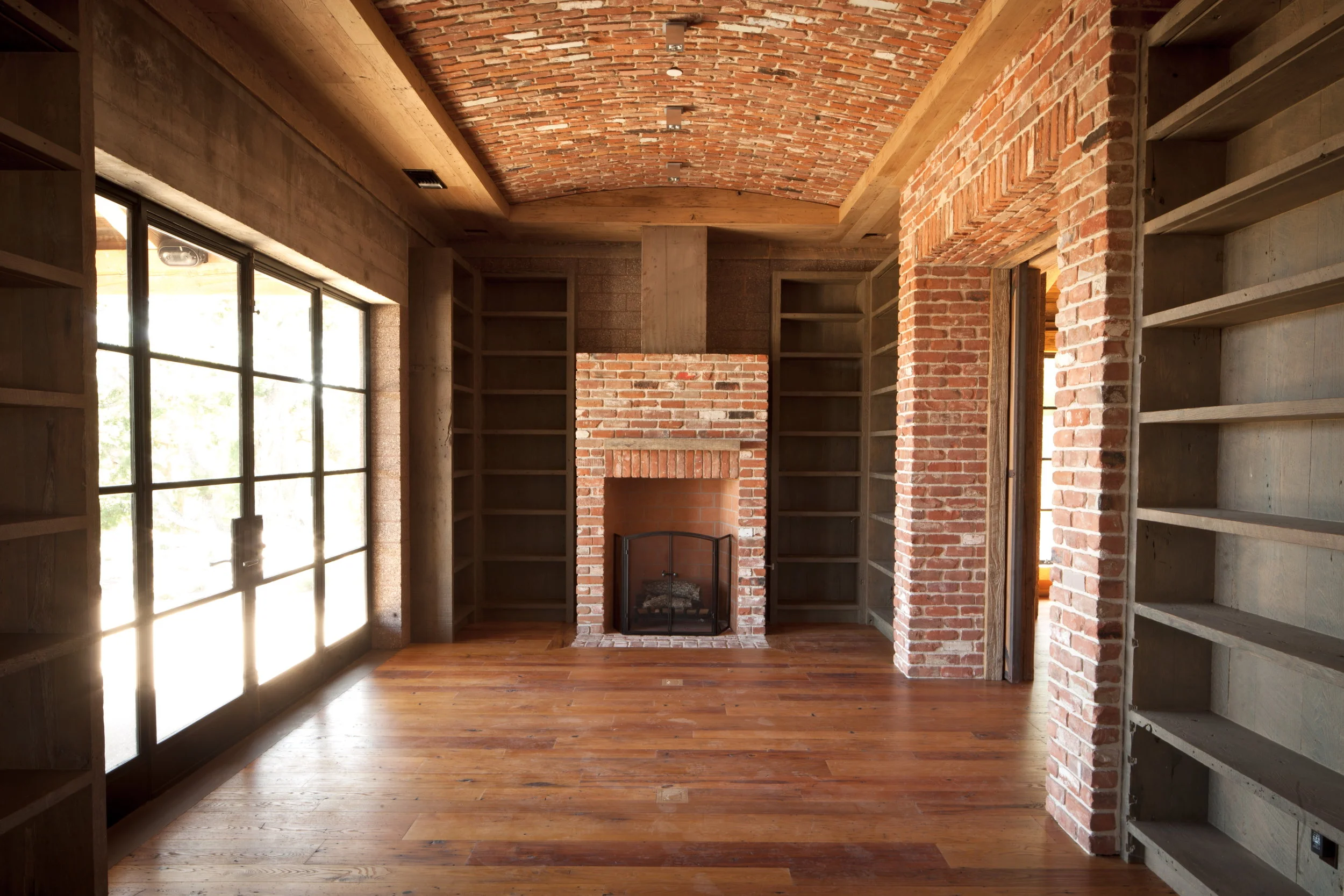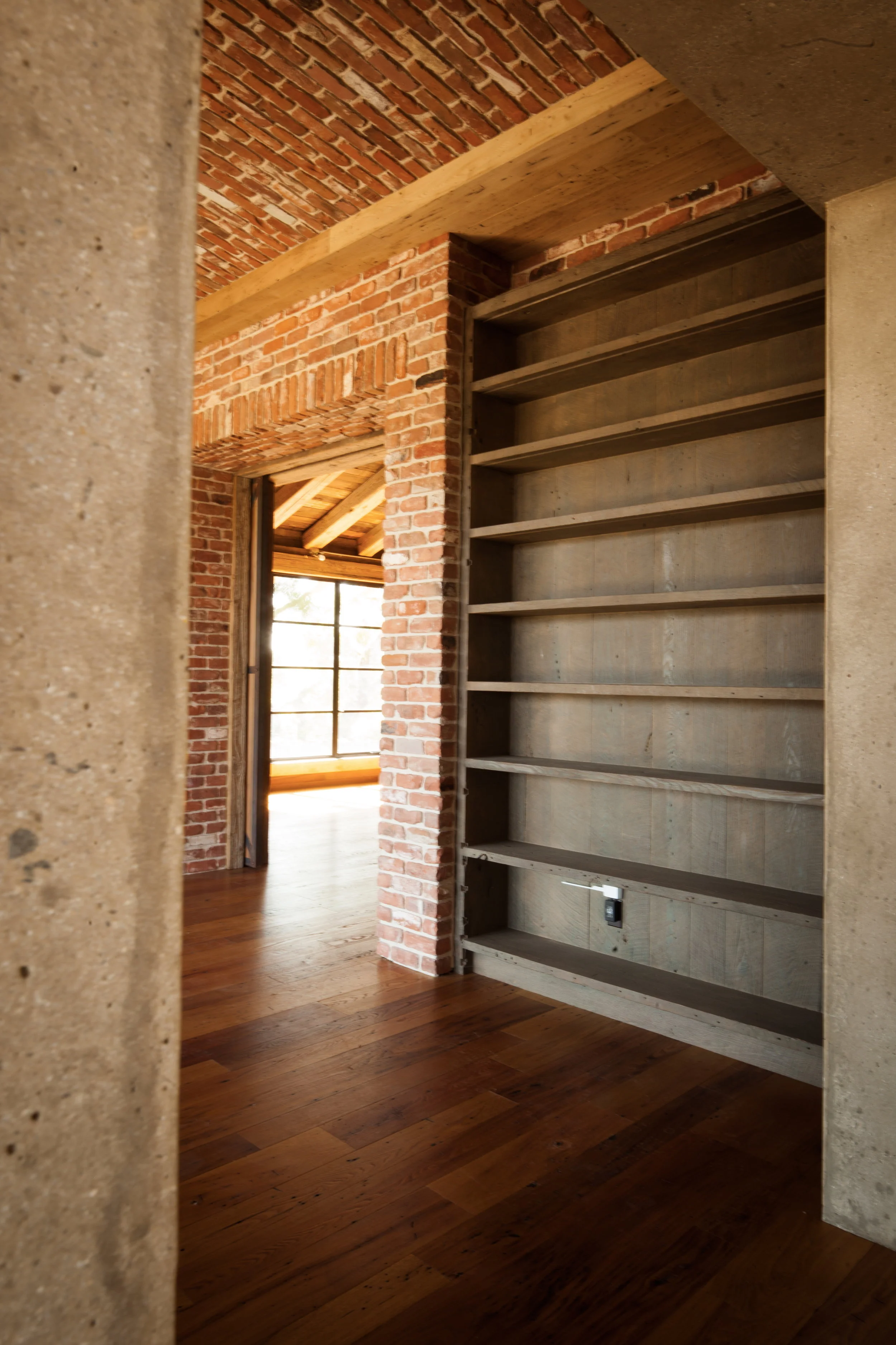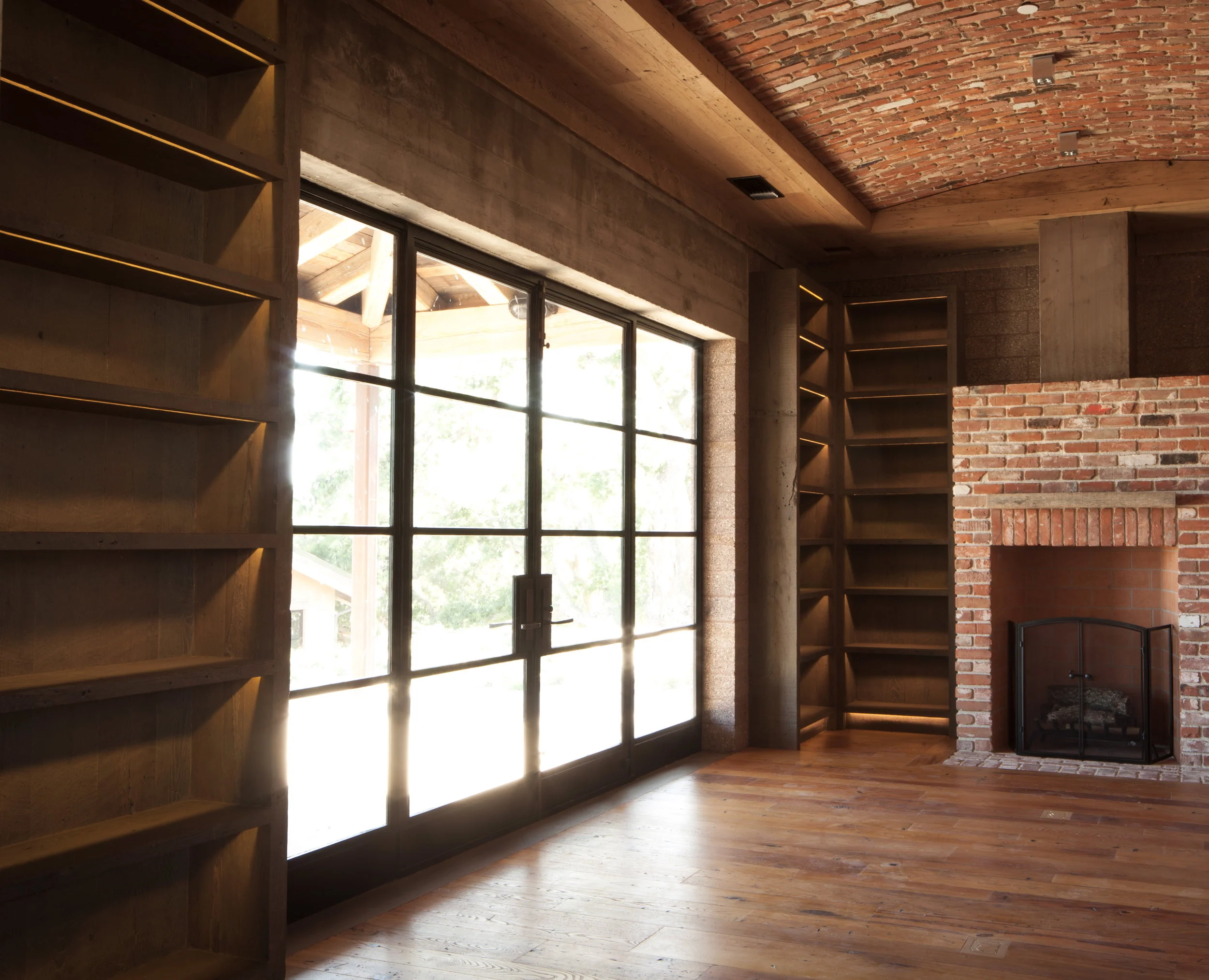 /Library shelving at the last big project that I worked on with John Brigham and his crew (a group of local craftsmen). Photos by Joel Wilson.We put an angled dado cut on the bottom of every shelf. This provided for continuous LED lighting strips (see above photo). Looking into master bedroom (above).