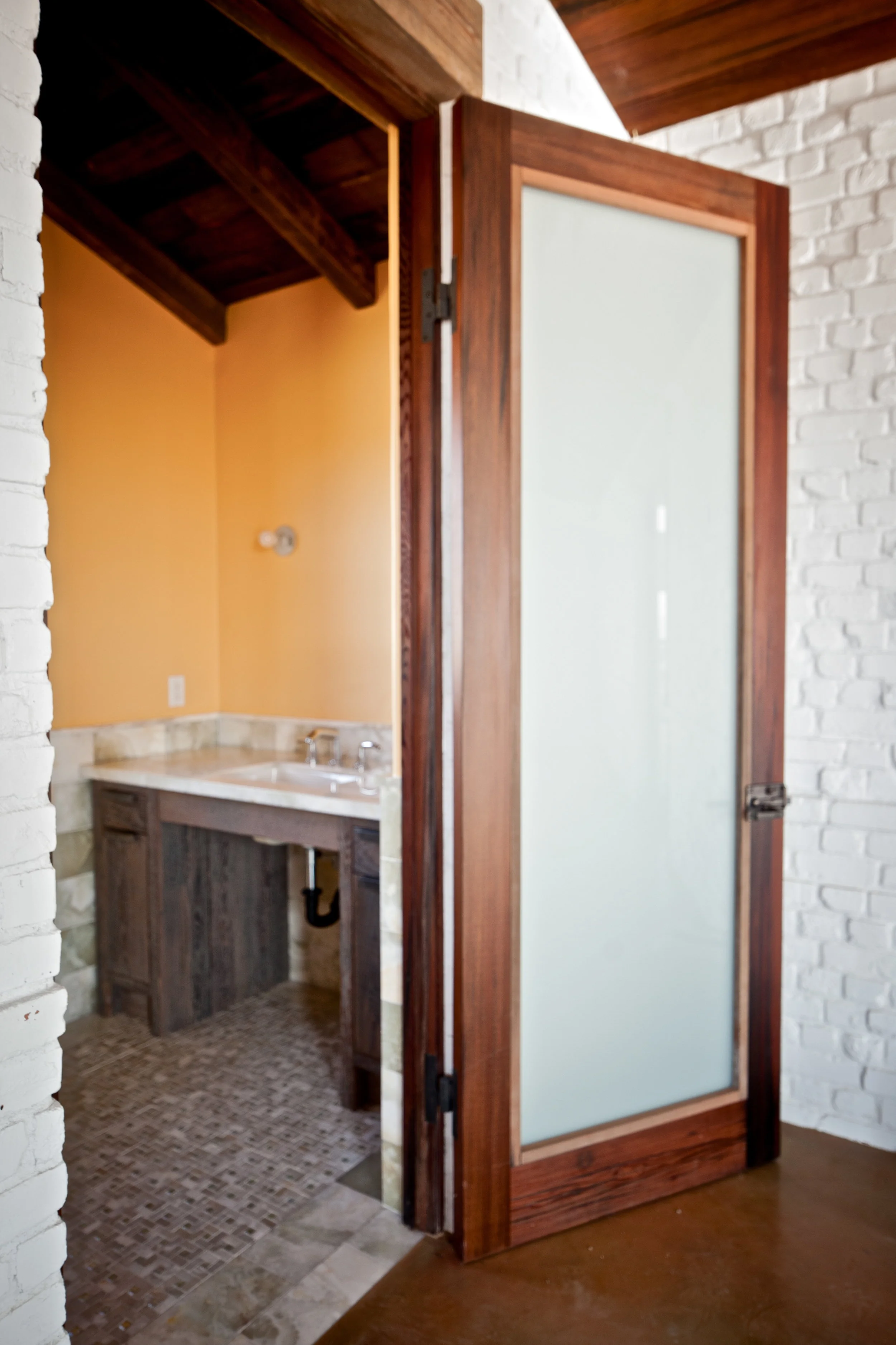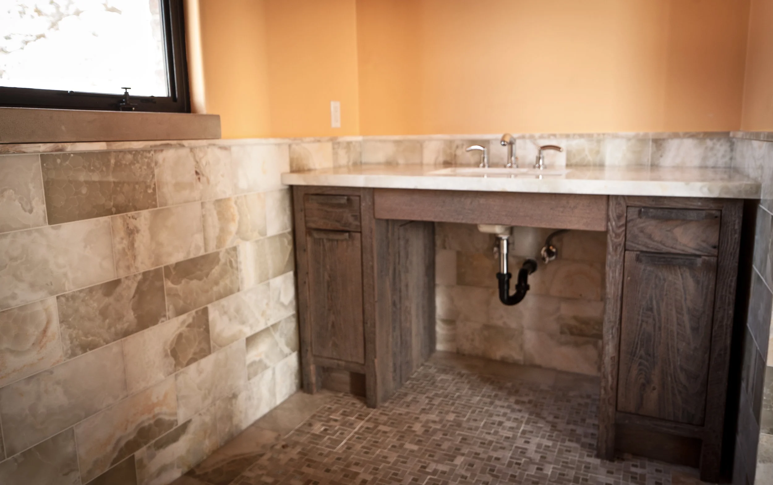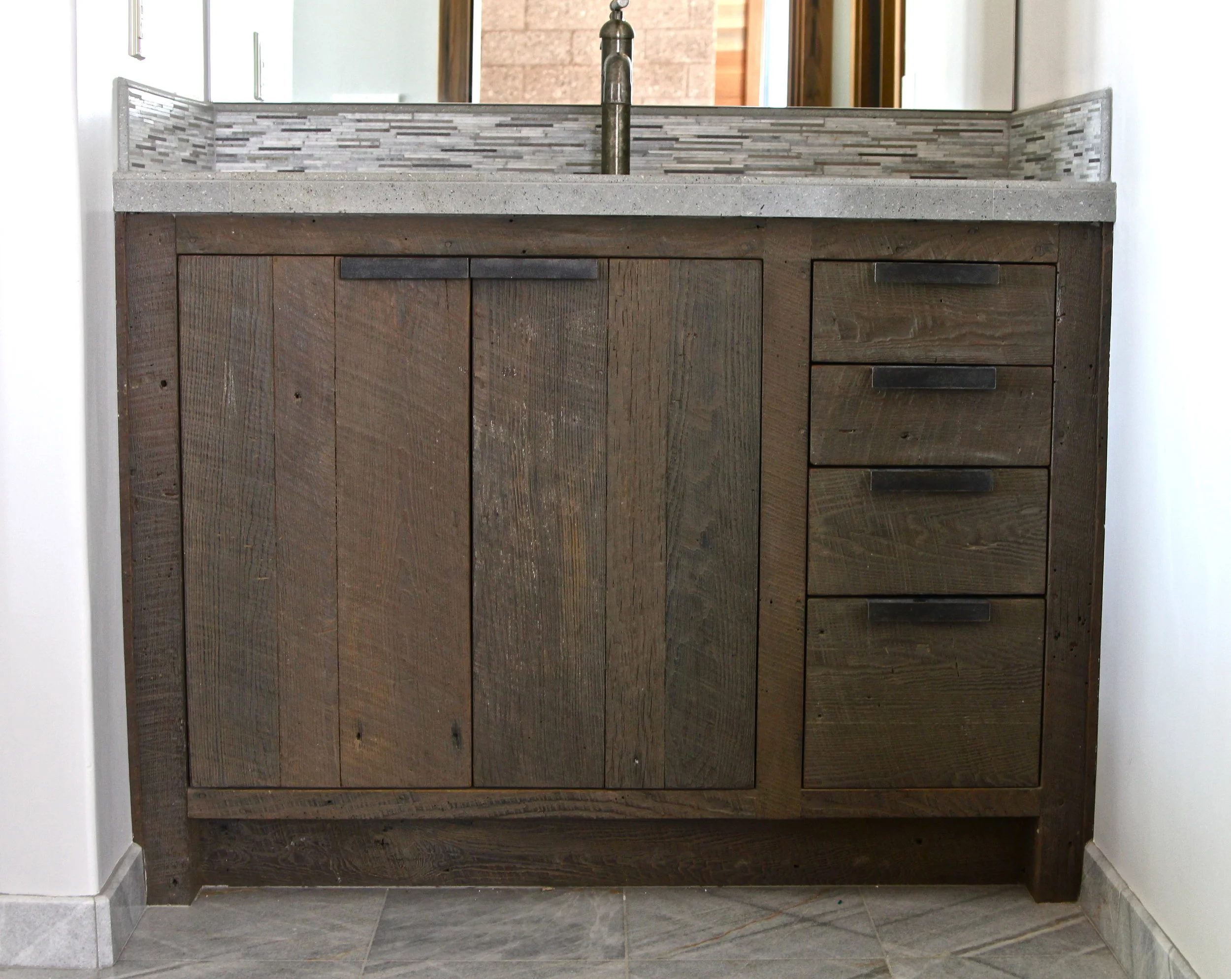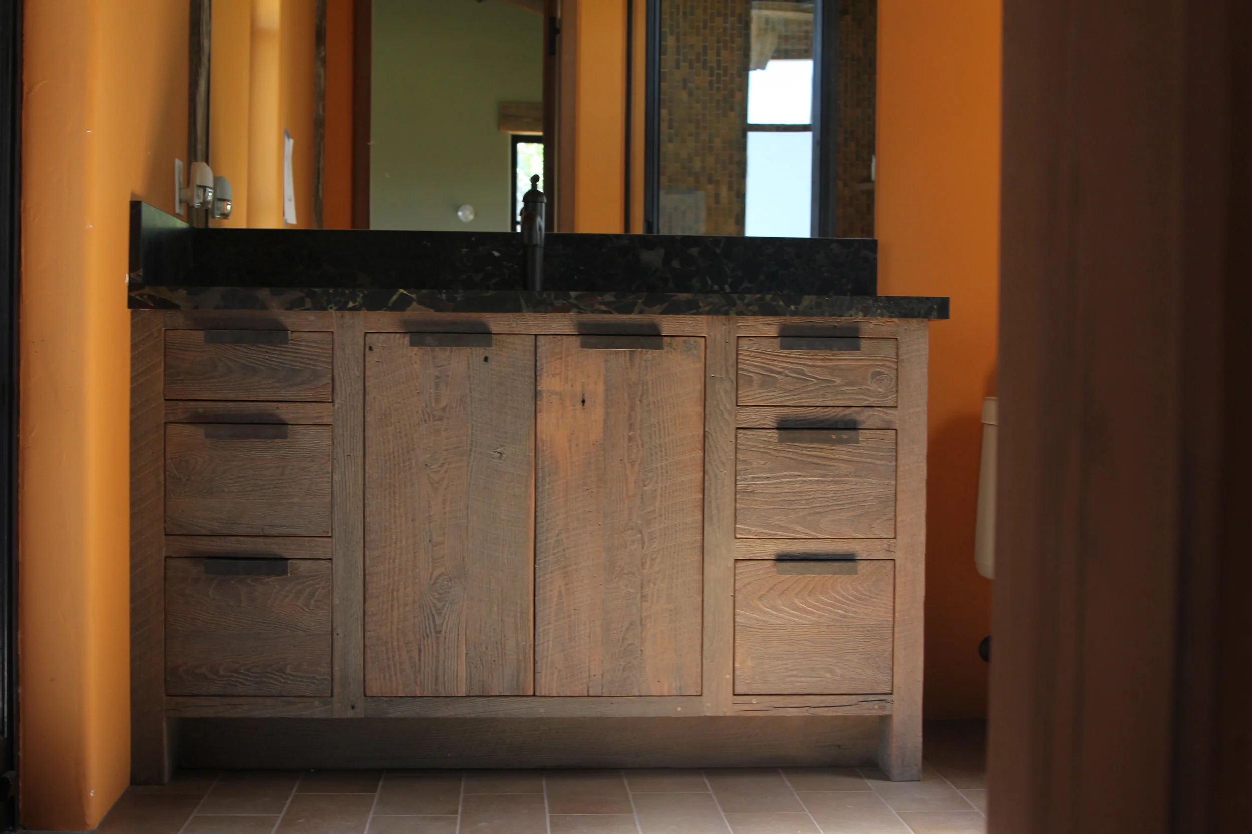October 11, 2012 Rustic Modern Bathroom Vanities October 11, 2012/ Ben Riddering Vanities made from reclaimed wormy chestnut. Custom made steel door/drawer pulls.