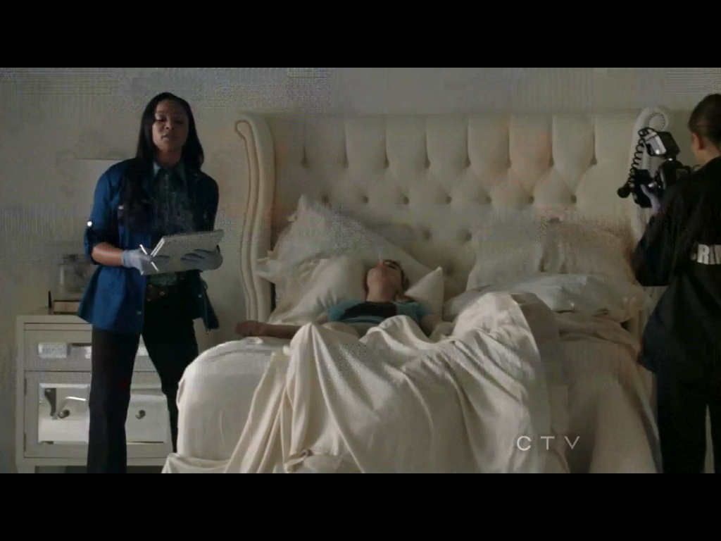 /My wife and I finished building our new bed (finally!). It's been a long process of weekend and evening work. Funny thing is, this piece was inspired by a murder scene! We occasionally watch a sitcom called "Castle". When this murder scene (below) came on the screen Shannon paused the show, turned to me and said, "I want that bed!" She made a screenshot of the scene, which we used for our inspiration, and we began working on it.