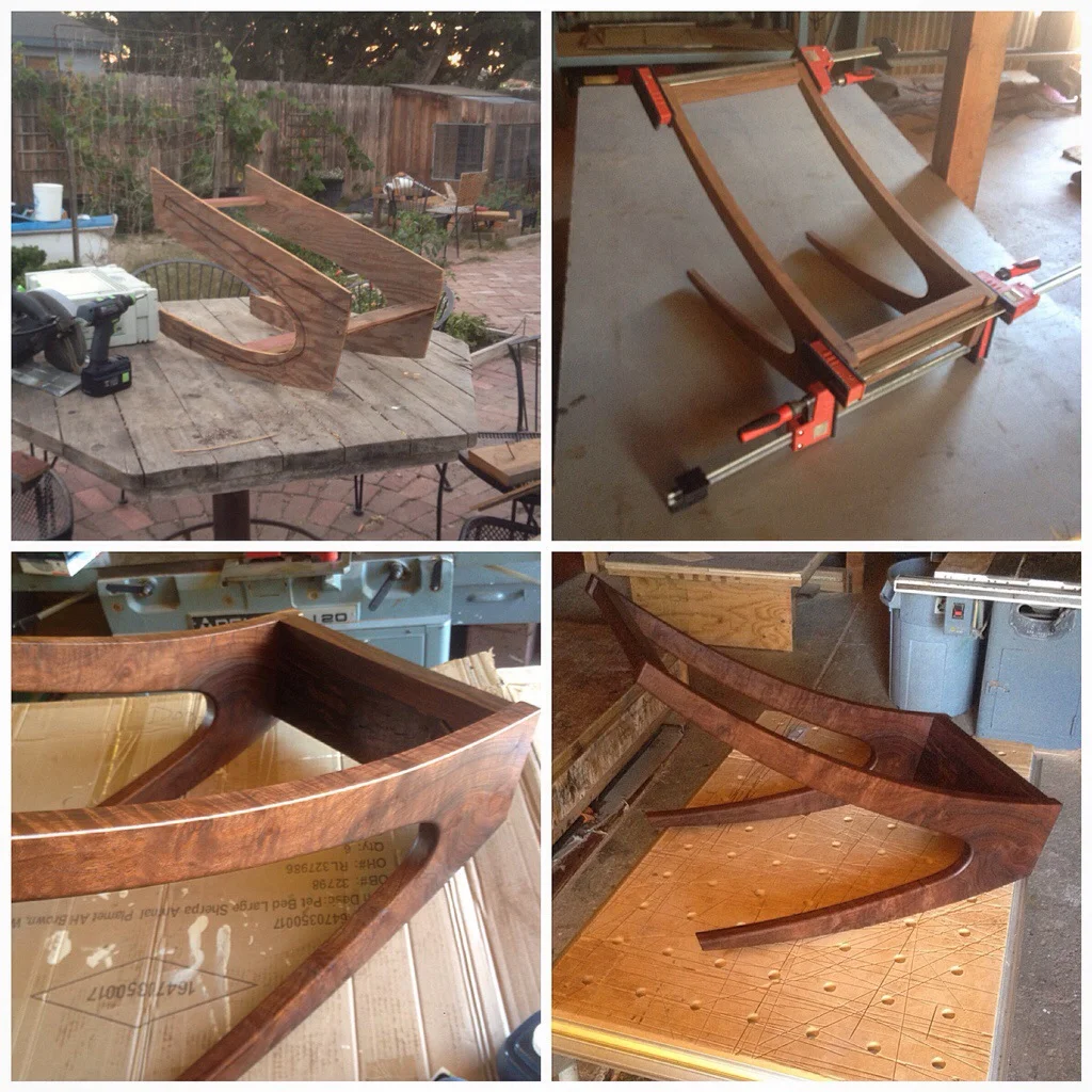 /My newest son, Oliver, was born on the 17th, so I took the week off. After a couple of days I got stir crazy and found myself mocking up this baby seat on our back patio. Once the project was started I couldn't stop. Here's a few photos of Ollie's new rocking chair frame. I will post an update when we get the leather seat made. Made from local Claro Walnut.