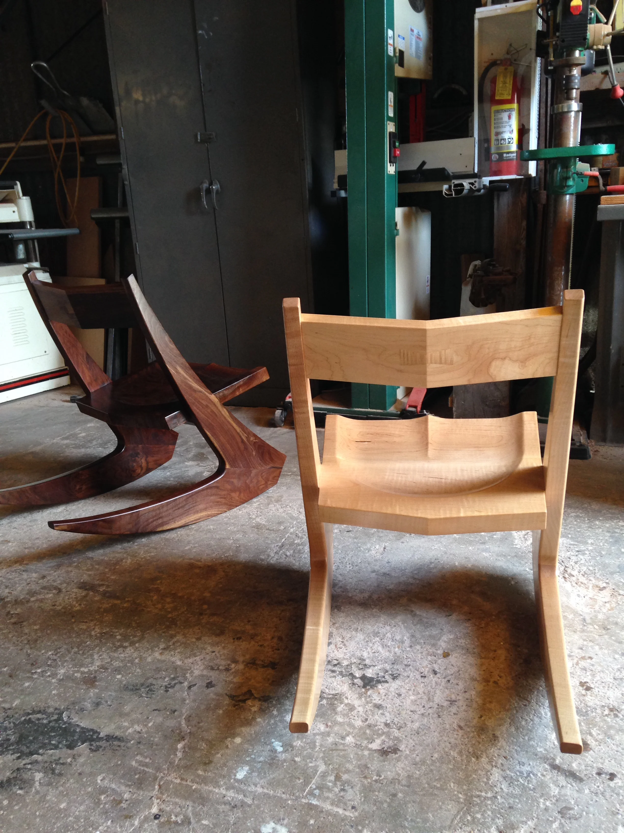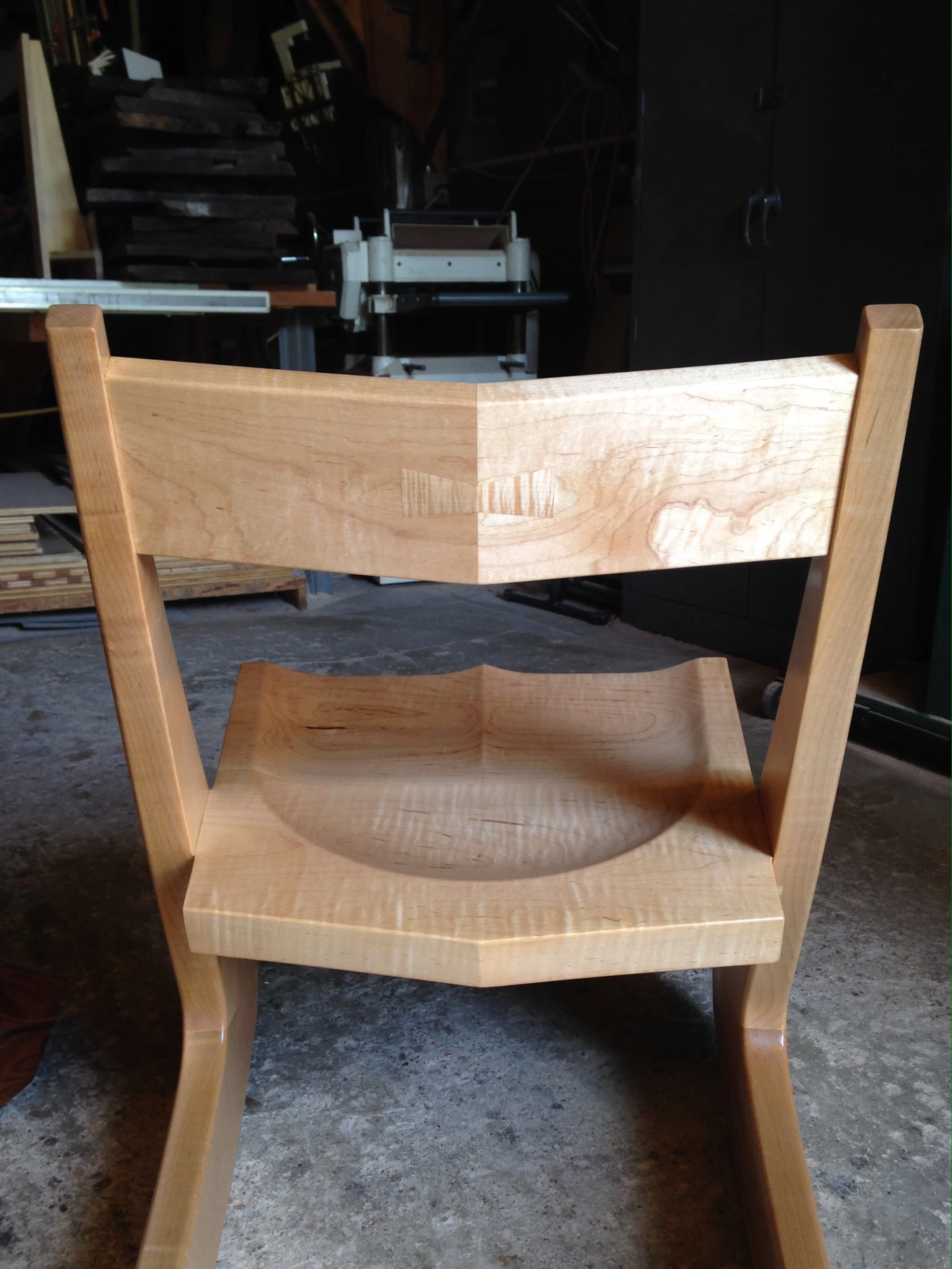 Bow tie inlays have become trendy and overplayed these days, but they do still have their place...and I think this chair back is one of those places. A couple of Hairpin rocking chairs waiting for the next coat of oil. Made from curly maple and claro walnut.